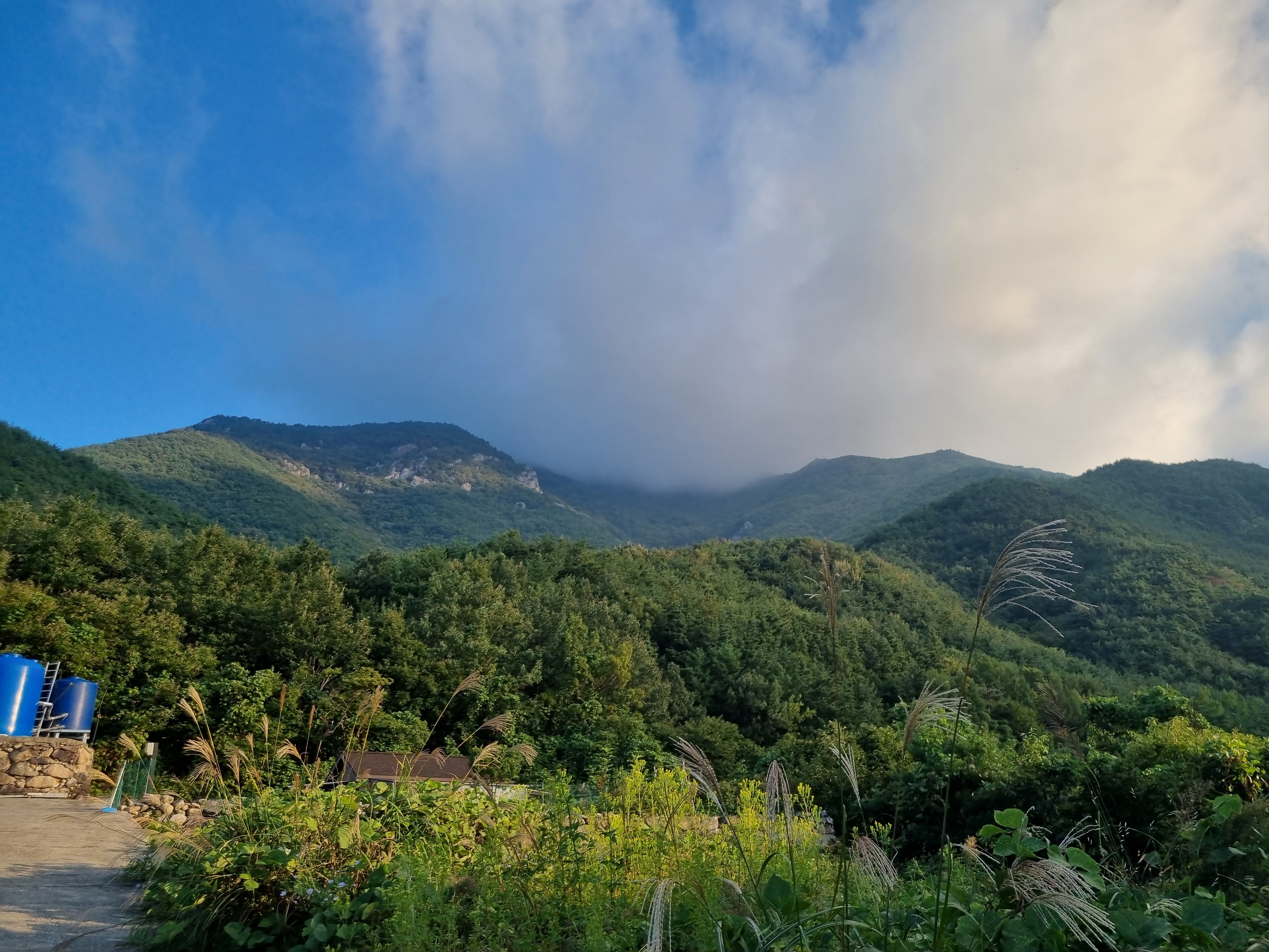 들머리인 하양마을에서 올려다본 운문산~~ 정상부가 구름에 가리워져 뭔가 위압감이 드는 풍경이다.