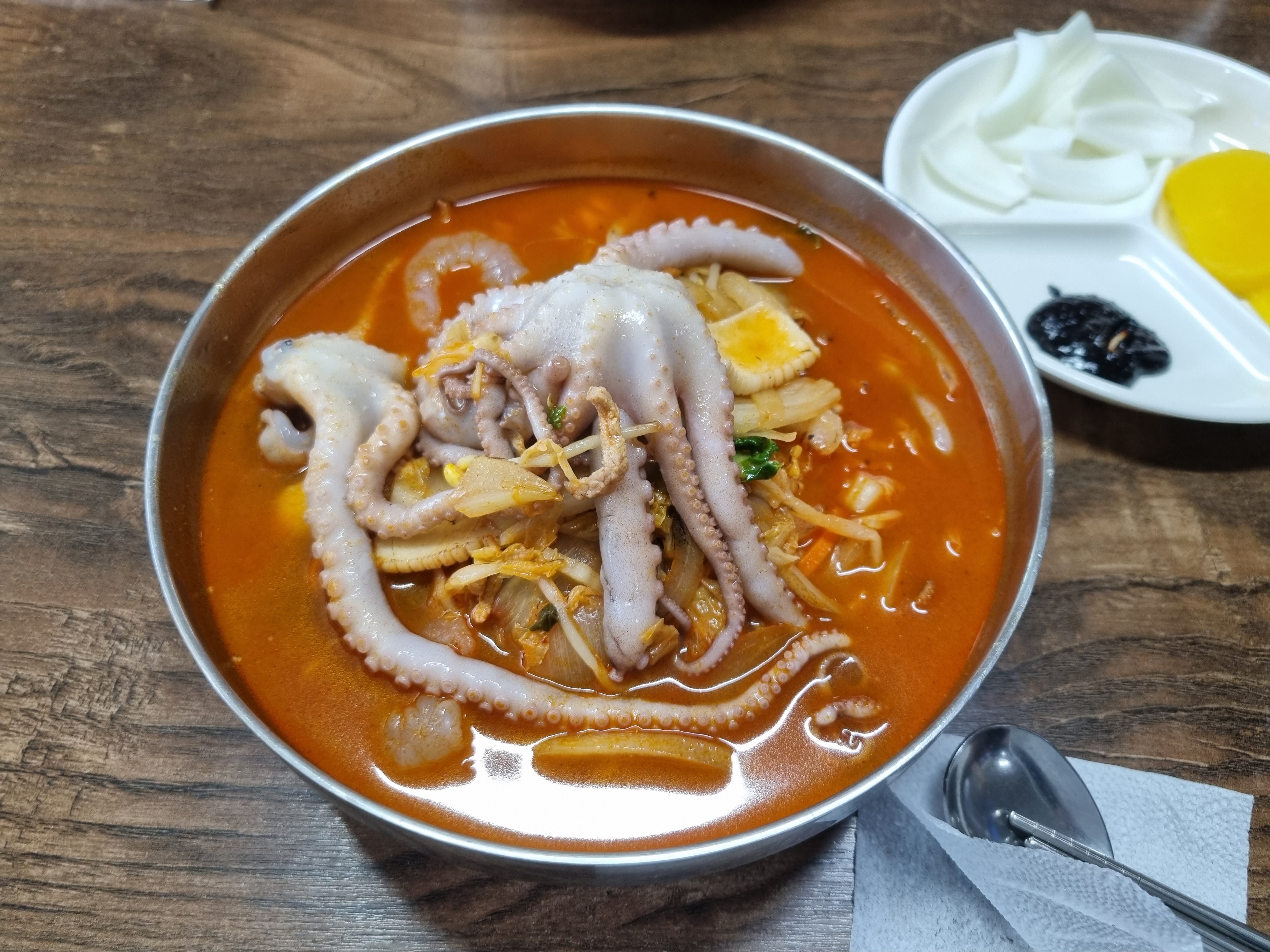 하산해서 다음 목적지인 경남 합천까지 거의 2시간 가까이 차로 이동해서 다음 산을 오르기전에 점심으로 먹은 해물 짬뽕인데 낙지 한마리가 통째로 들어간 비주얼이 그로테스크하지만 웬지 짬뽕이랑 낙지의 조합이 그리 잘 어울리지는 않는 듯한 맛이었다. 원래 이 식당에서 유명한 메뉴는 합천 해인사가 가까워서인지 스님들이 먹을 수 있도록 고기가 들어가지 않은 채식 짜장면인 스님짜장이라는 메뉴였는데 그거나 먹어볼 걸 하는 생각이~~