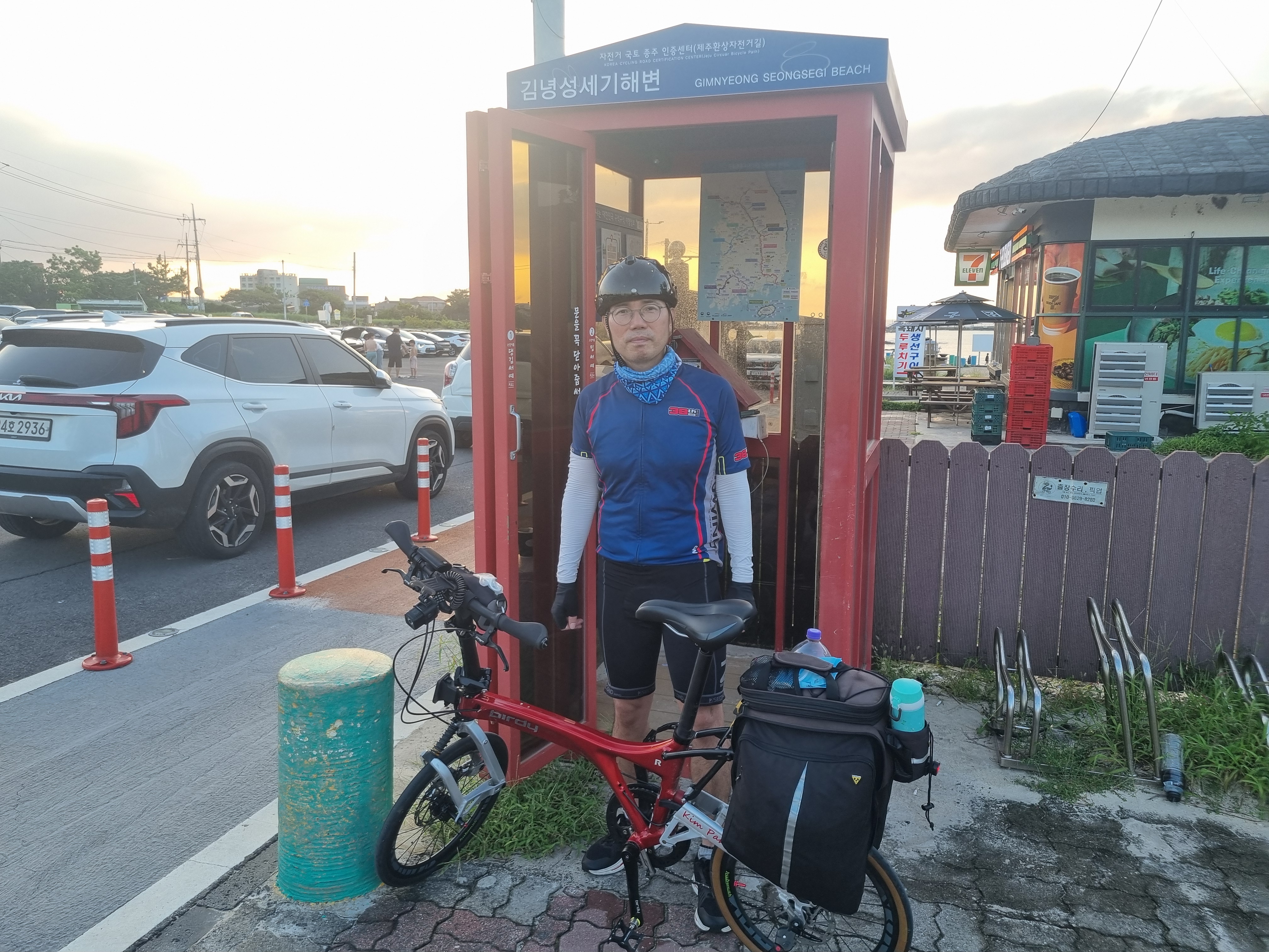 공항에 내려서 자전거 찾고 포장을 뜯어서 이런저런 정비를 하고 출발한 시간이 오후 2시 30분을 조금 넘긴 시간~~ 먼저 가까운 용두암인증센터 들렀다가 근처 편의점에서 음료수 마시면서 찍은 사진~~ 너무 덥다보니 계속 편의점에서 음료수만 찾게된다.