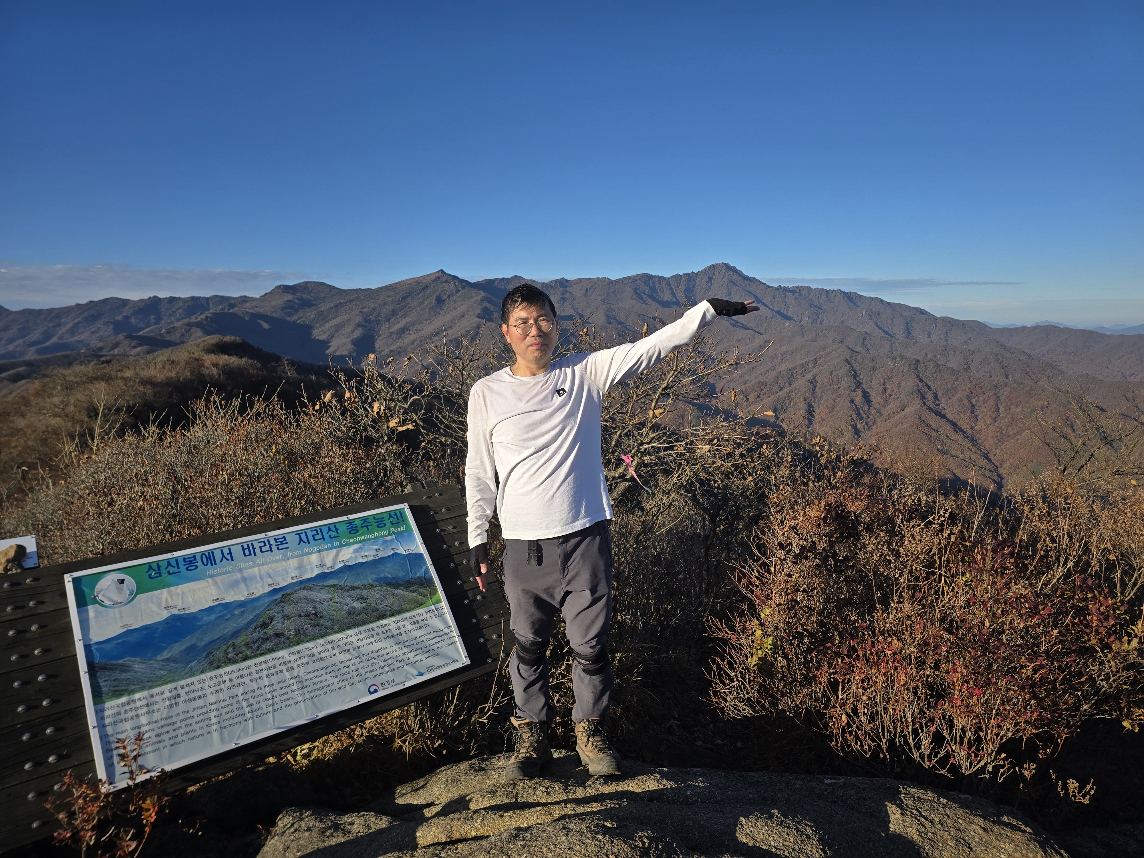 이날 날도 정말 좋았고 오른 산들 모두 조망이 훌륭했지만 그중에서도 삼신봉이 가장 뛰어난 조망을 보여준다. 천왕봉도 잘 보이고 반야봉, 노고단까지 한눈에 볼 수 있는 곳이었다.