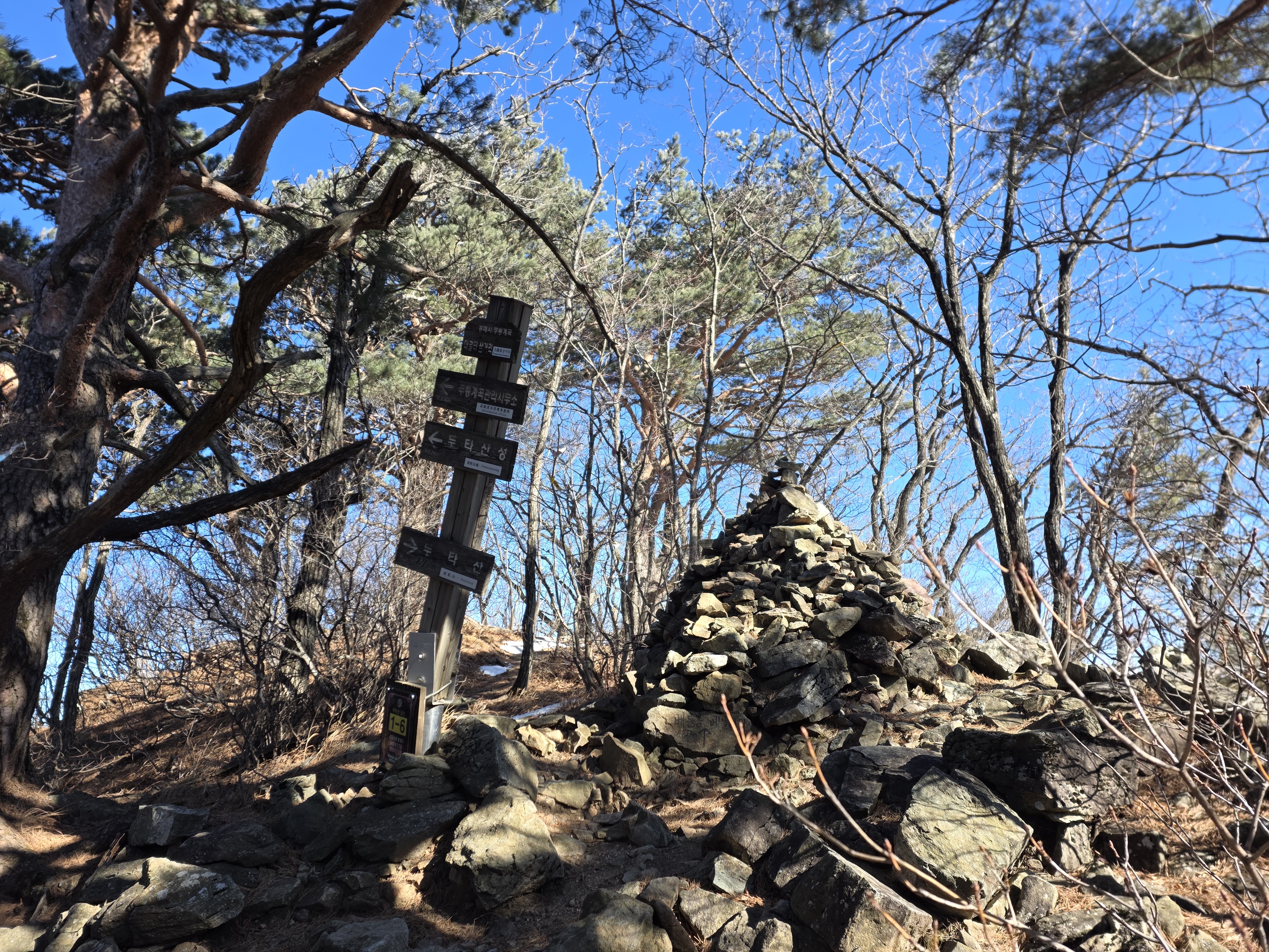 앞으로 보이는 돌무더기들이 예전에 산성을 쌓았던 흔적인데 굳이 이 높은곳에 산성을 쌓을 필요가 있나 싶다.